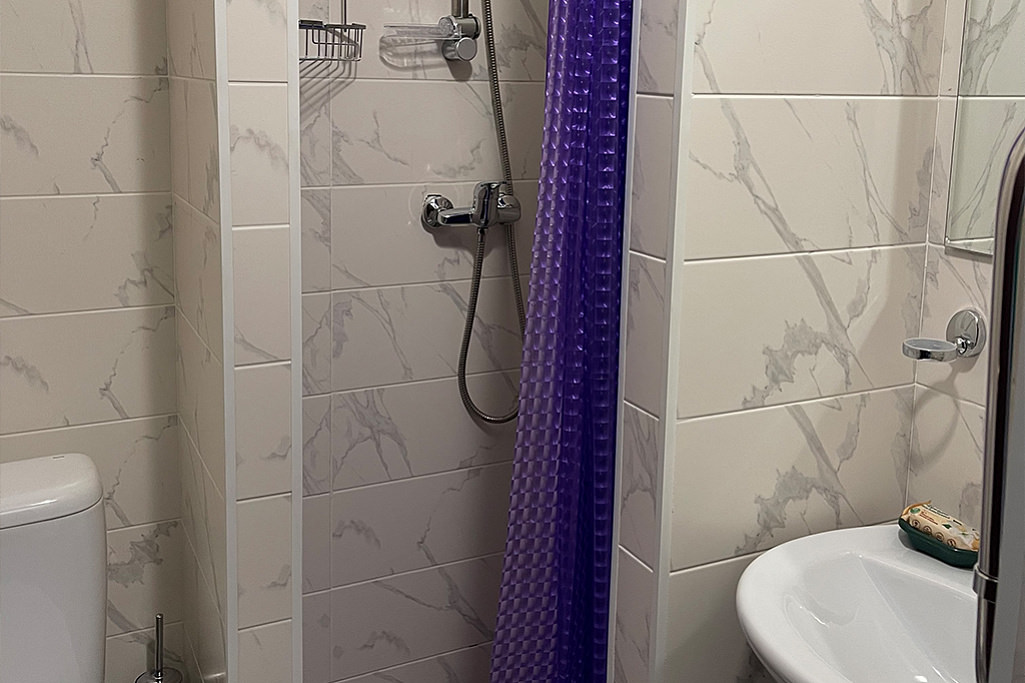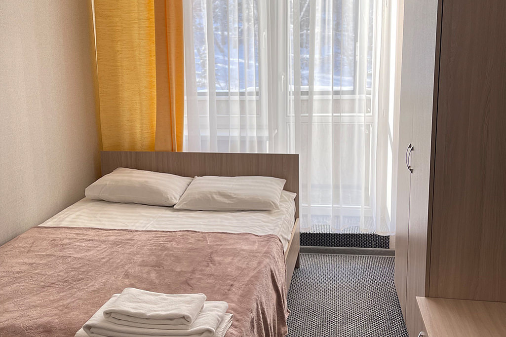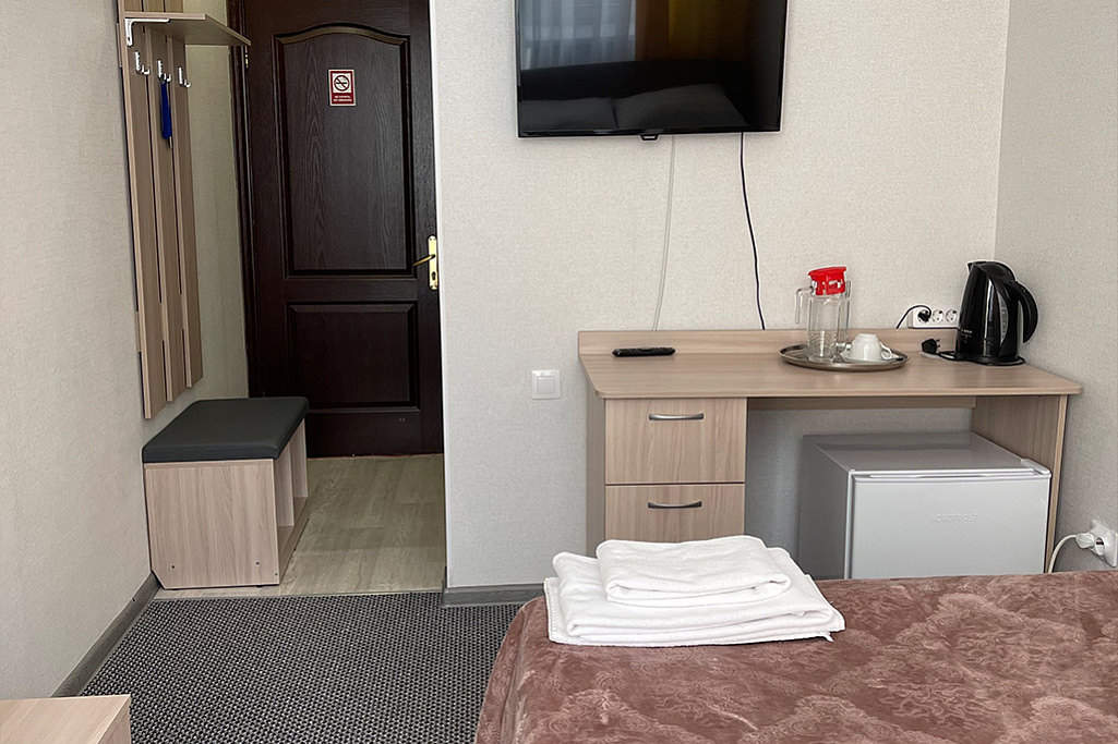 Площадь номера - 12 кв.м. 1 осн. место. 1 доп. место. Мебель: кровать полутороспальная, стол, стул, тумба, шкаф. Оборудование: телевизор, холодильник, чайный набор посуды, электрочайник. Санузел: душевые на этаже, раковина в номере, туалет в номере. Сервис: Wi-Fi бесплатно, смена полотенец, смена постельного белья, уборка номера.