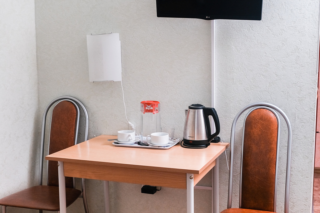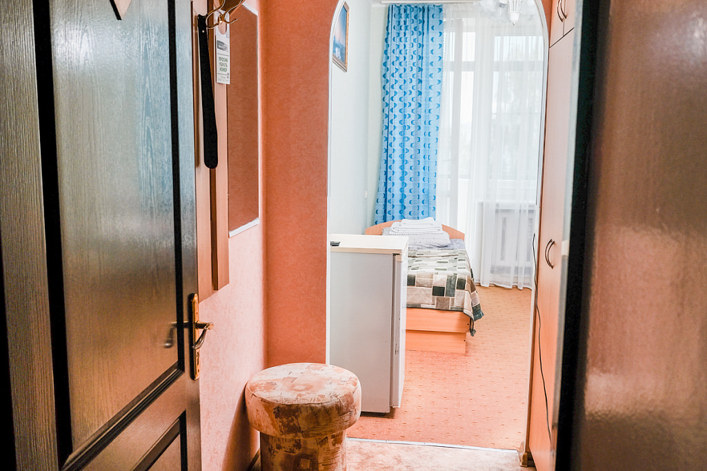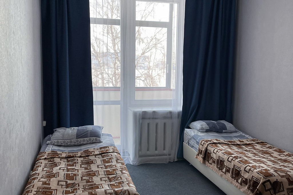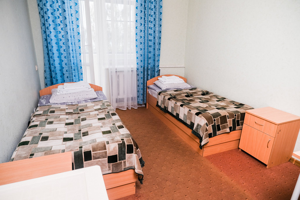 Площадь номера - 13 кв.м. 2 осн. места. Мебель: кровати односпальные, прикроватные тумбочки, стол, стул, шкаф. Оборудование: телевизор, холодильник, чайный набор посуды, электрочайник. Санузел. Сервис: Wi-Fi бесплатно, смена полотенец, смена постельного белья, уборка номера.