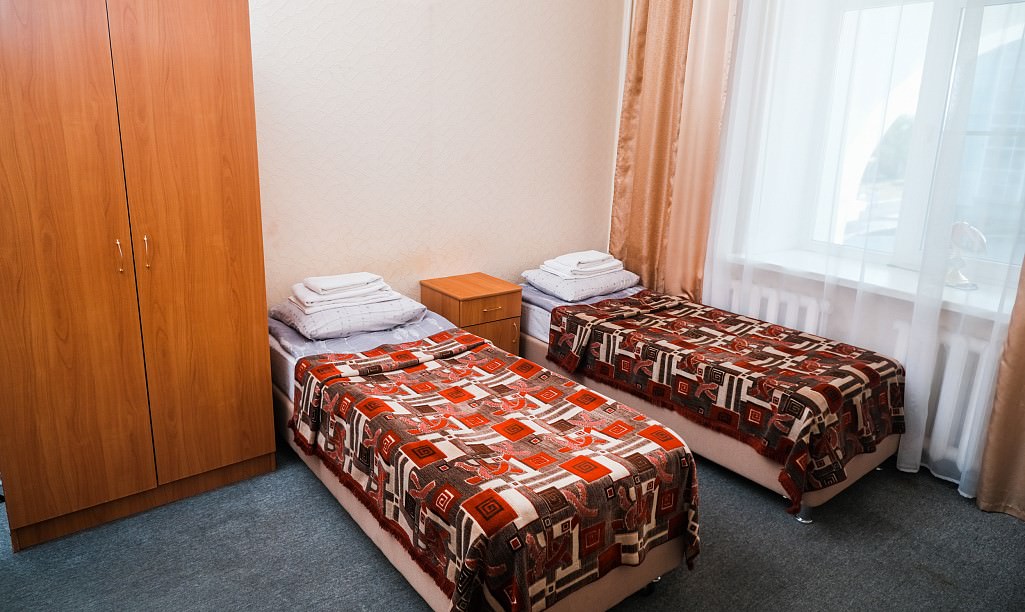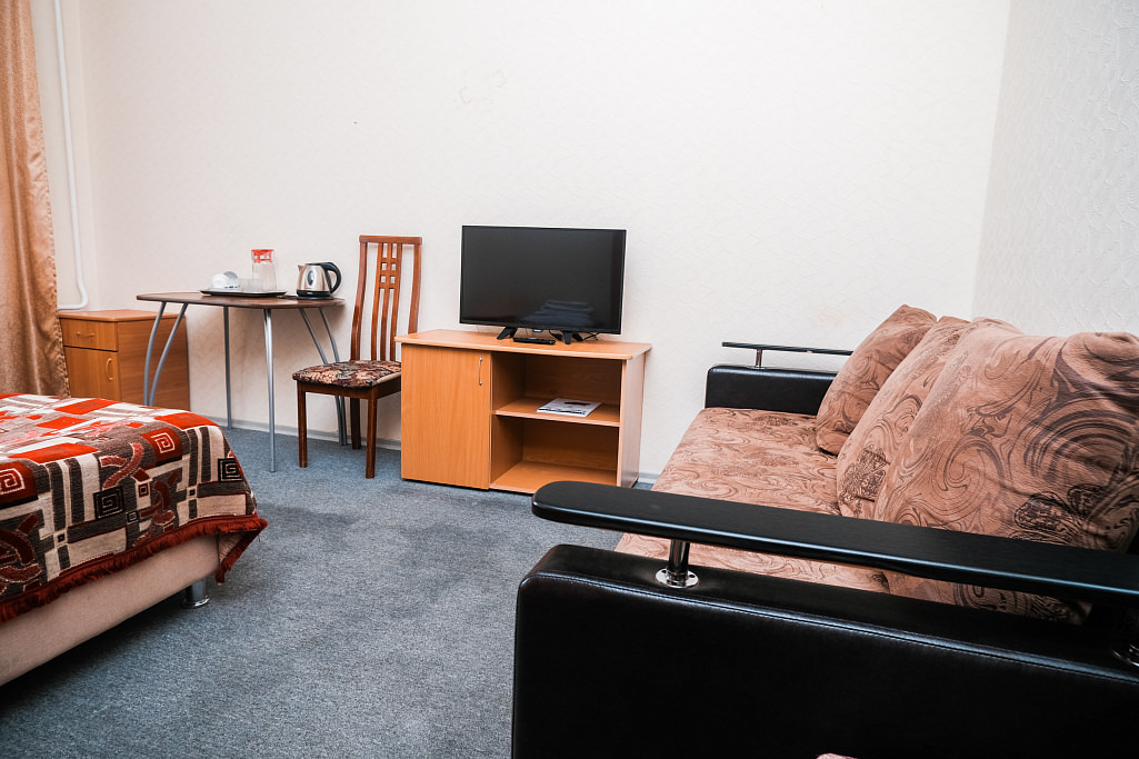 Площадь номера - 30 кв.м. 3 осн. места. 2 доп. места. Мебель: диван раскладной, кровати односпальные, прикроватные тумбочки, стол, стул, шкаф. Оборудование: телевизор, холодильник, чайный набор посуды, электрочайник. Санузел. Сервис: Wi-Fi бесплатно, смена полотенец, смена постельного белья, уборка номера.
