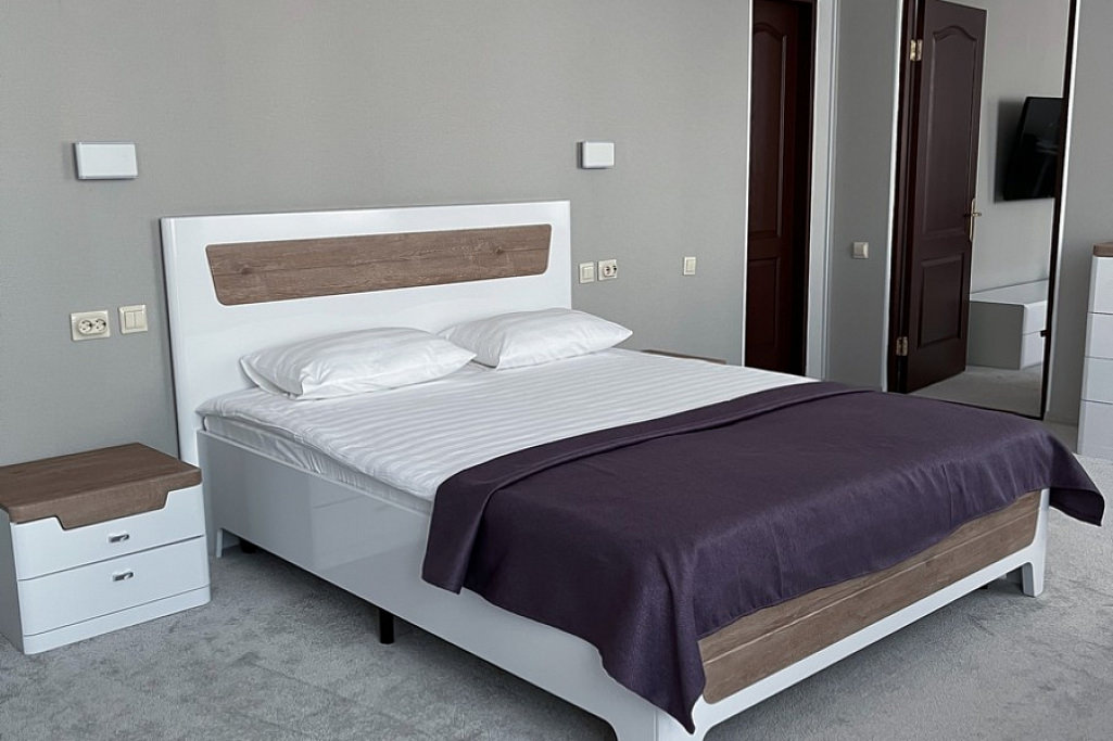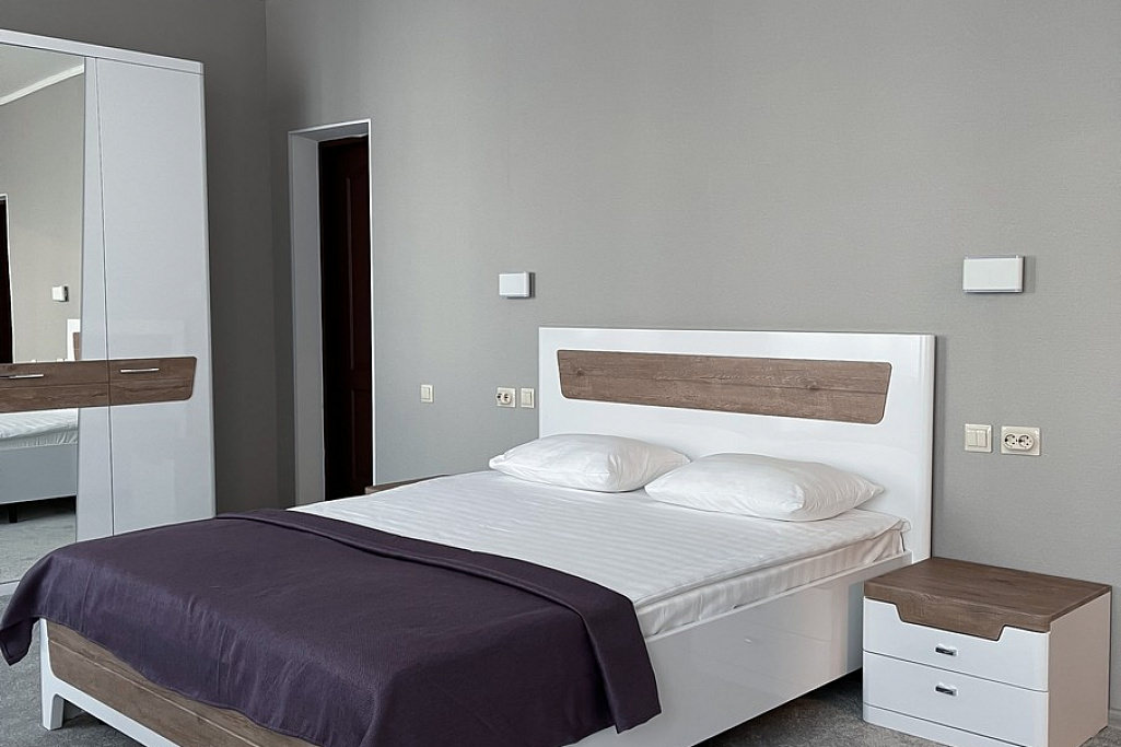 Площадь номера - 26 кв.м. 2 осн. места. 2 доп. места. Мебель: диван раскладной, кровать двуспальная, прикроватные тумбочки, стол, стул, шкаф. Оборудование: телевизор, холодильник, чайный набор посуды, электрочайник. Санузел: 2 санузла, с душевой кабиной, туалетные принадлежности, фен. Сервис: Wi-Fi бесплатно, смена полотенец, смена постельного белья, уборка номера.