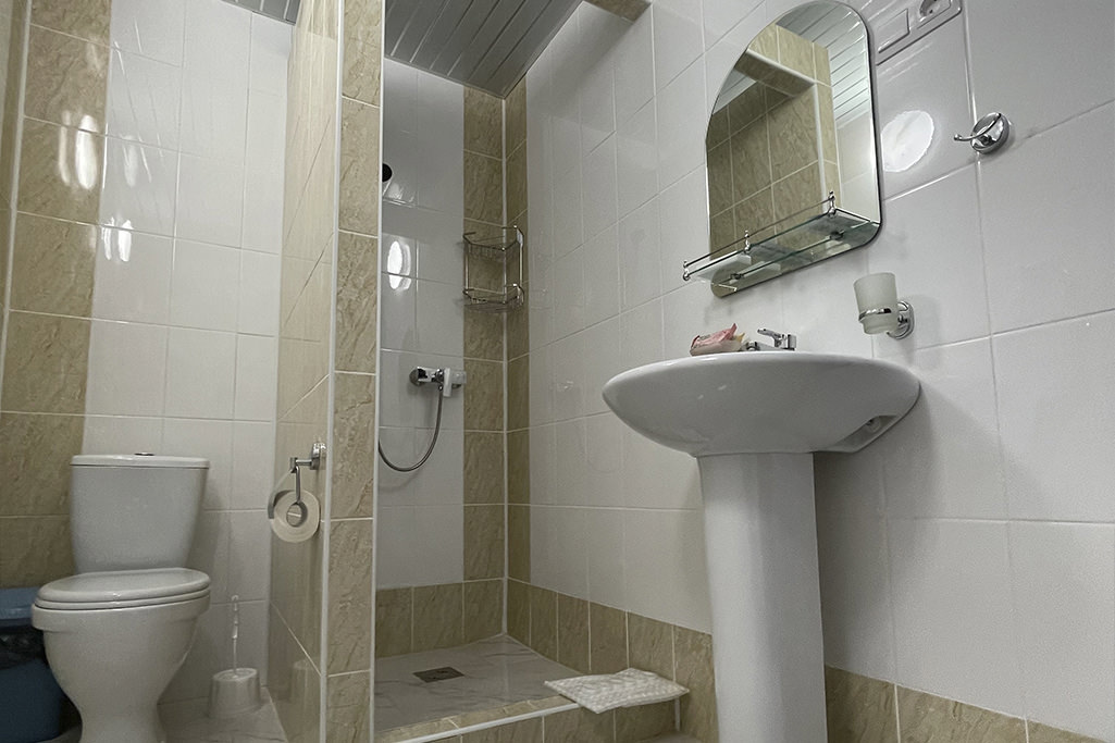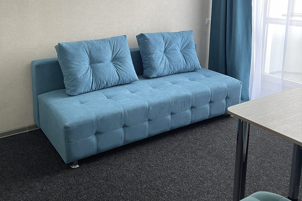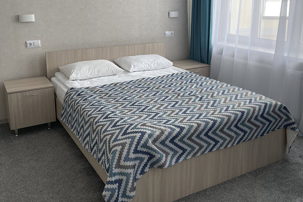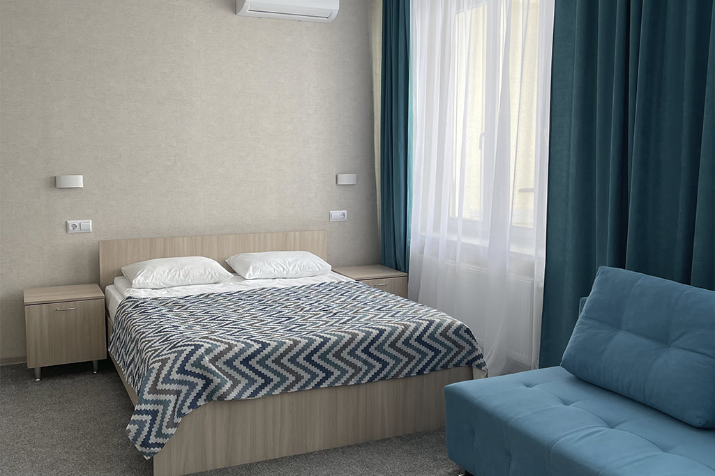 Площадь номера - 25 кв.м. 2 осн. места. 1 доп. место. Мебель: диван раскладной, кровать двуспальная, прикроватные тумбочки, стол, стул, шкаф. Оборудование: телевизор, холодильник, чайный набор посуды, электрочайник. Санузел: с душевой кабиной, тапочки, туалетные принадлежности, фен, халат. Сервис: Wi-Fi бесплатно, смена полотенец, смена постельного белья, уборка номера.